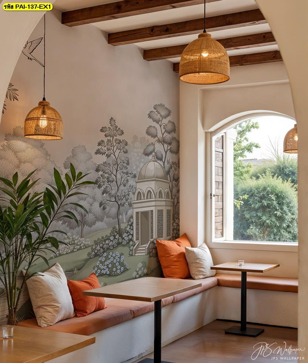 วอลเปเปอร์สวนป่า ศาลาโบราณกลางธรรมชาติ สื่อถึงความสงบและความร่มรื่นในทุกมุมร้าน
