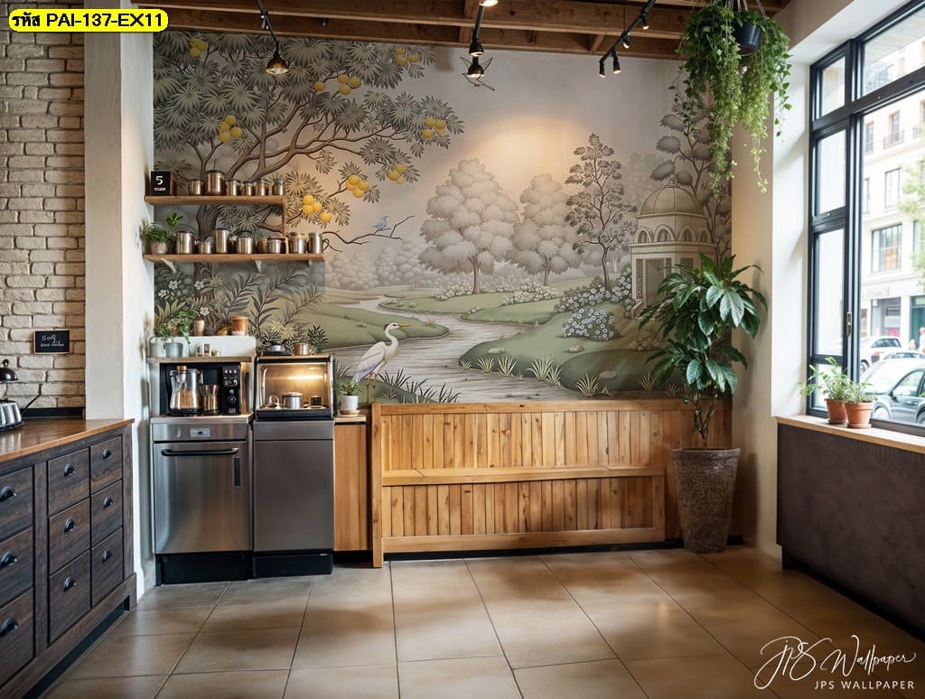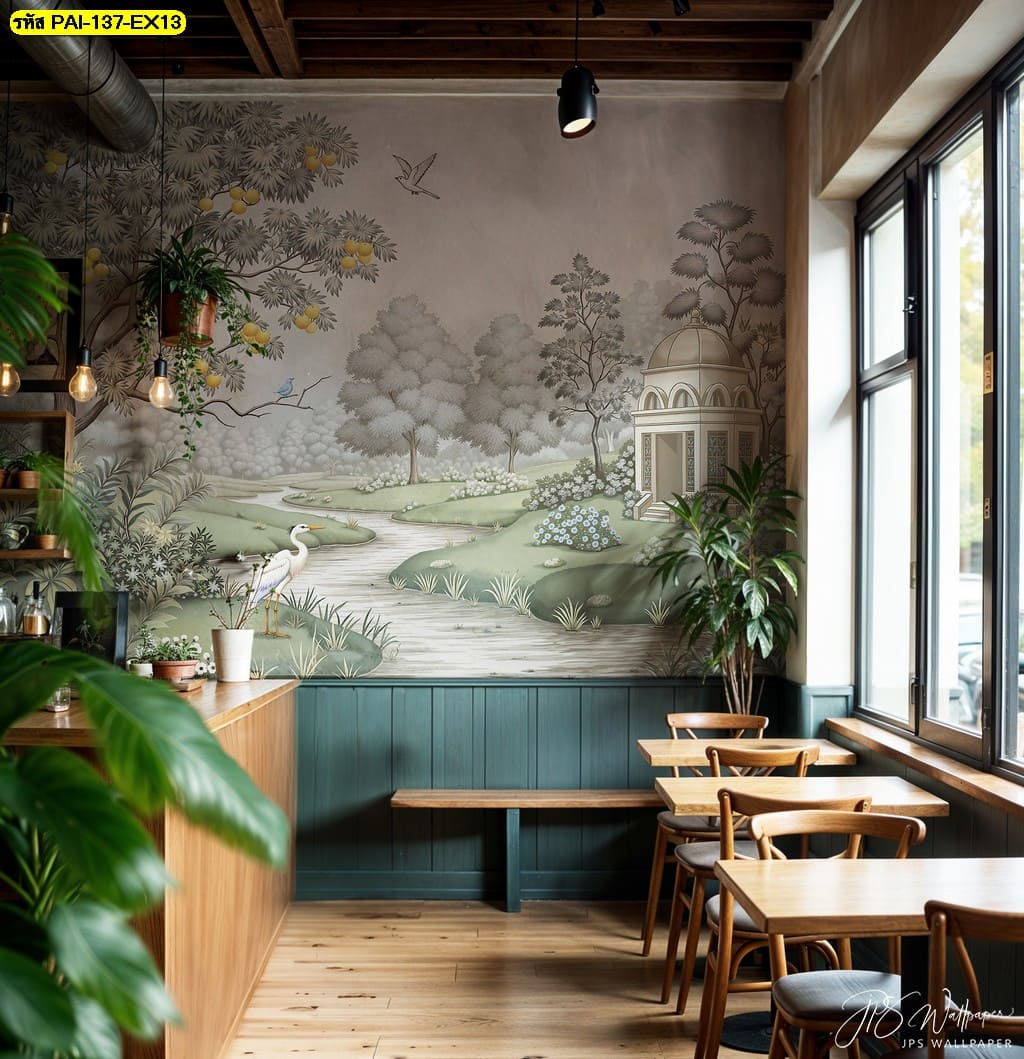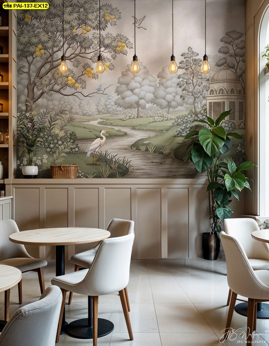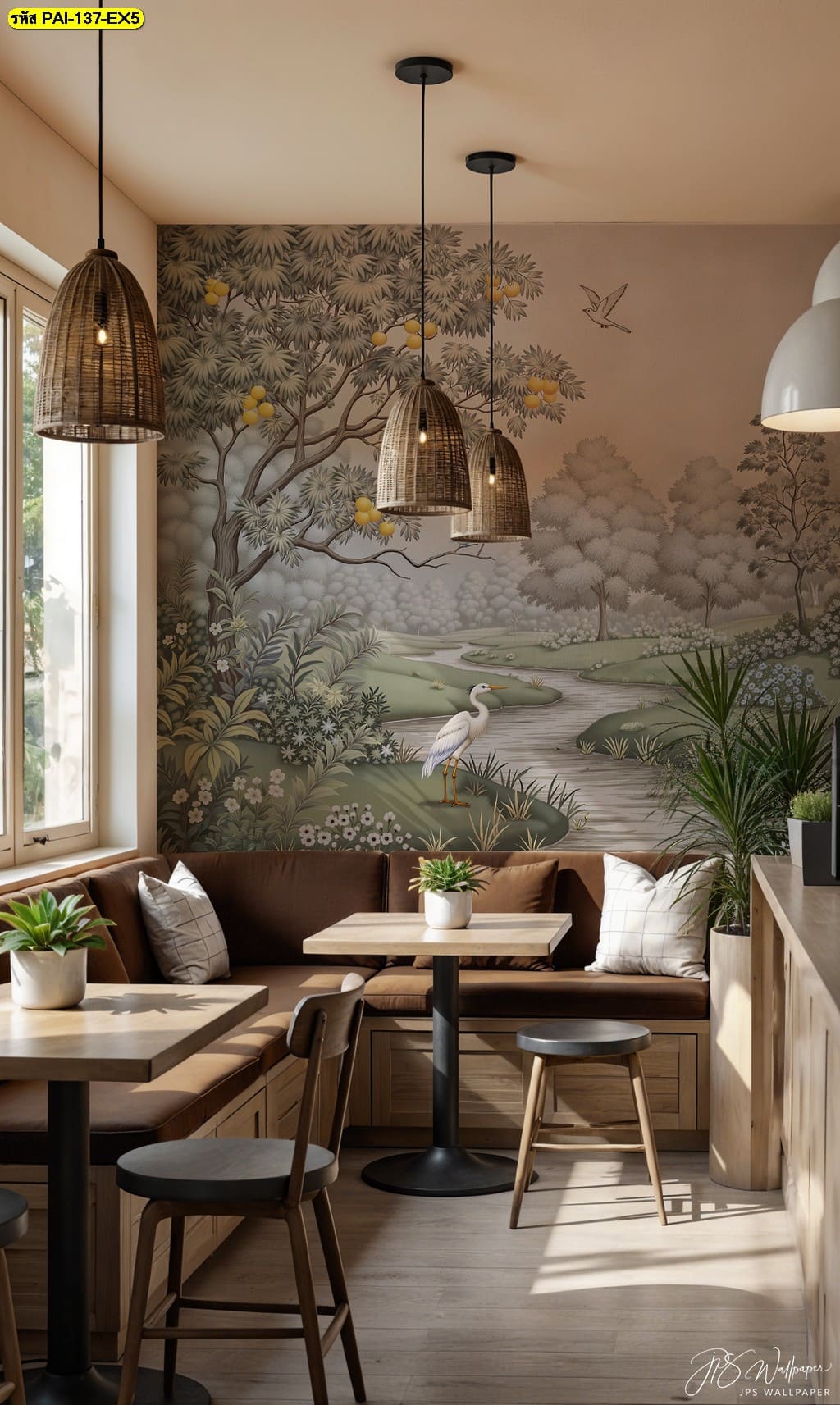 วอลเปเปอร์สวนป่าลำธารนกกระสา ถ่ายทอดความสงบและเชื่อมโยงธรรมชาติกับบรรยากาศร้าน