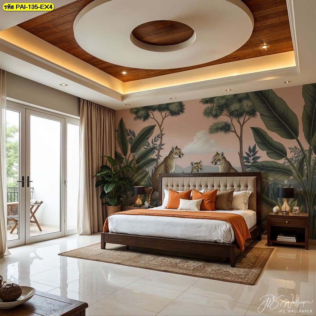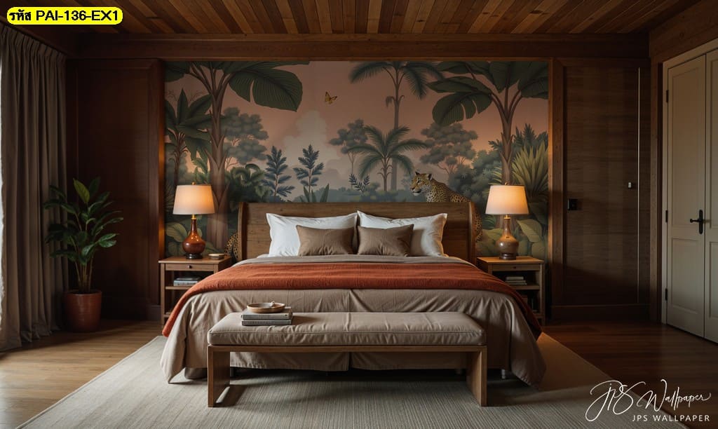 ห้องนอนโทนไม้เข้มอบอุ่น ผสานวอลเปเปอร์สวนป่าเสือดาวสร้างสมดุลระหว่างความหรูและธรรมชาติ