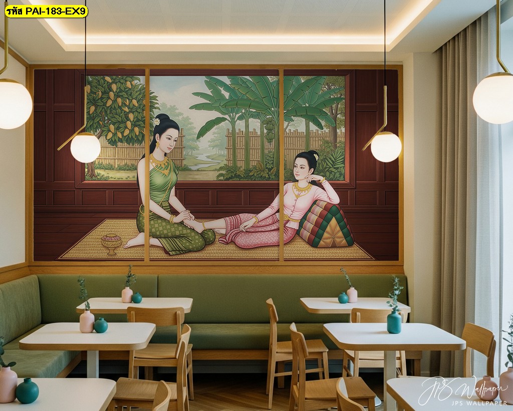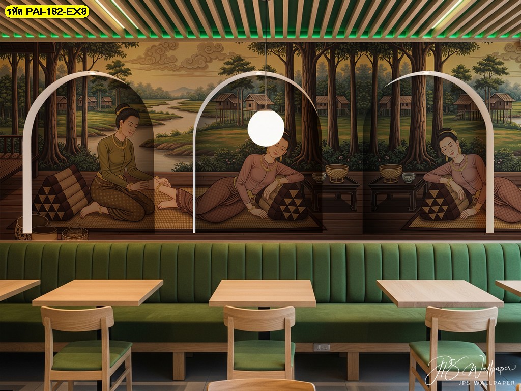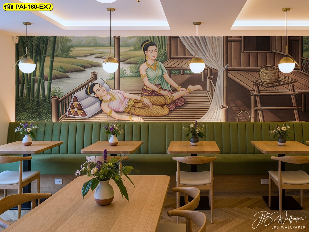 วอลเปเปอร์ลายไทยงดงาม ถ่ายทอดวิถีการนวดแผนโบราณ เพิ่มความอบอุ่นและเรื่องราวให้ร้านอาหารหรื