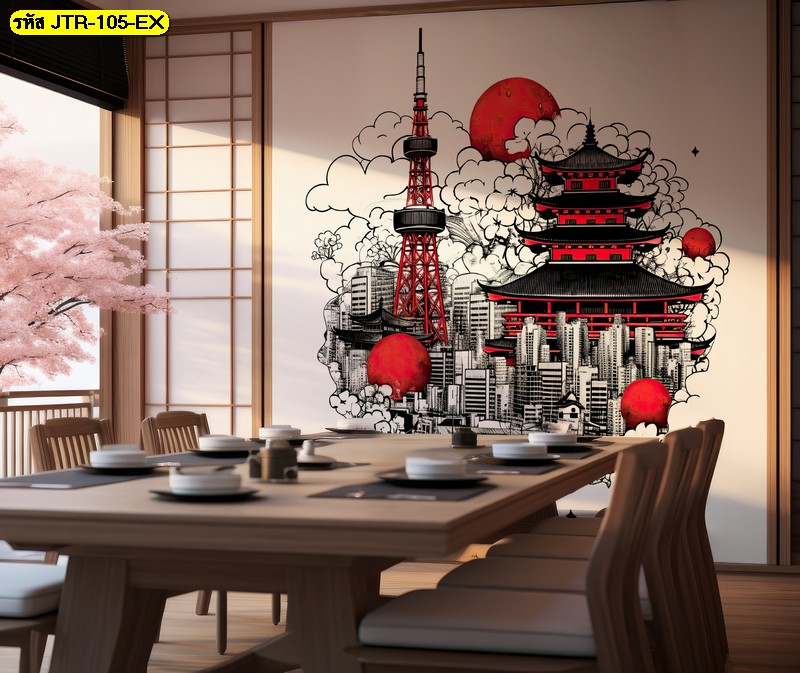 วอลเปเปอร์เจดีย์ญี่ปุ่นผสานวิวตึกสมัยใหม่ โทนแดงดำเท่คม เหมาะมากกับร้านอาหารญี่ปุ่นที่ต้อง