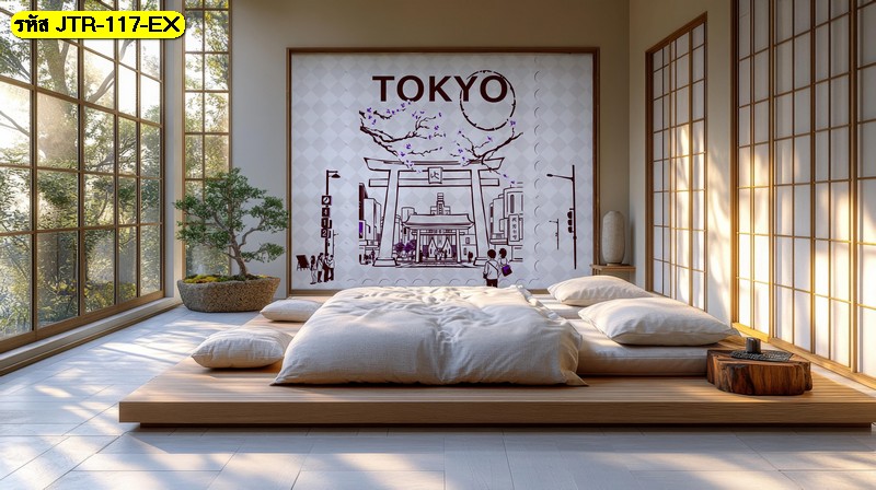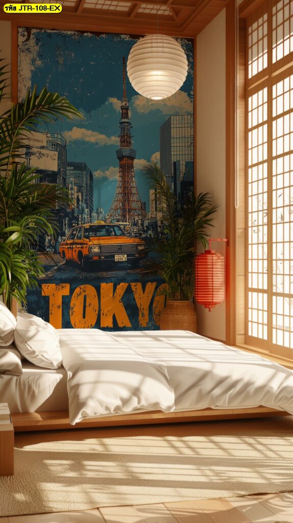 วอลเปเปอร์เมืองและหอคอยโทนฟ้าน้ำเงิน สร้างบรรยากาศสดชื่นเข้ากับห้องญี่ปุ่นแบบเรียบง่ายได้ดี