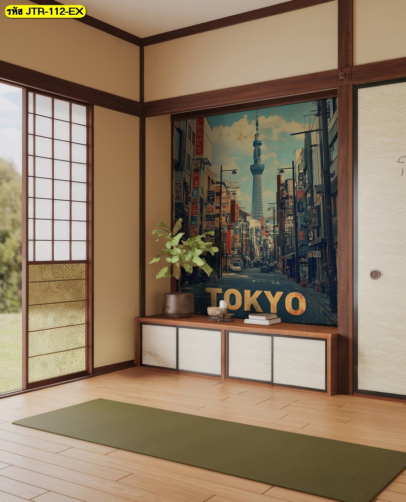 วอลเปเปอร์เมืองและหอคอยโทนฟ้าน้ำเงิน สร้างบรรยากาศสดชื่นเข้ากับห้องญี่ปุ่นแบบเรียบง่ายได้ด