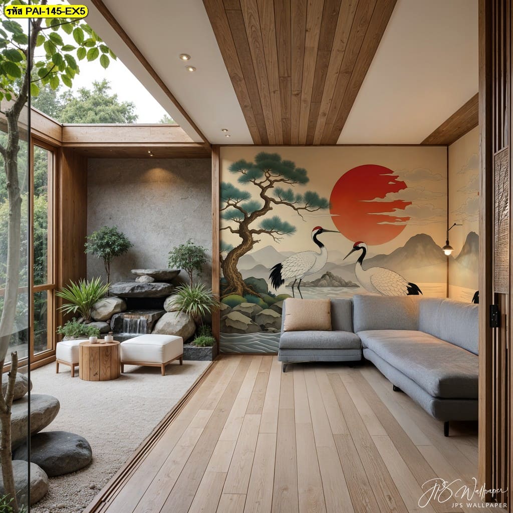 แต่งห้องนั่งเล่นสไตล์ญี่ปุ่นด้วยวอลเปเปอร์ลายนกกระเรียน