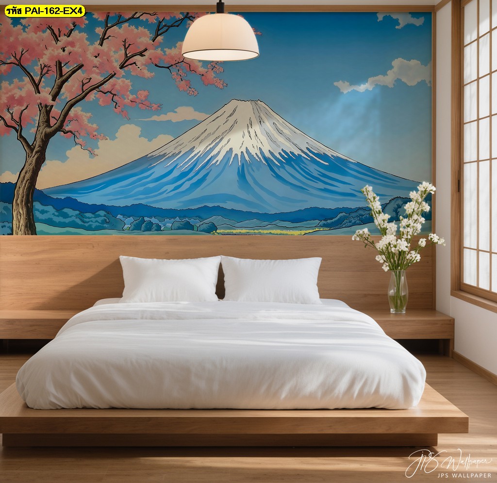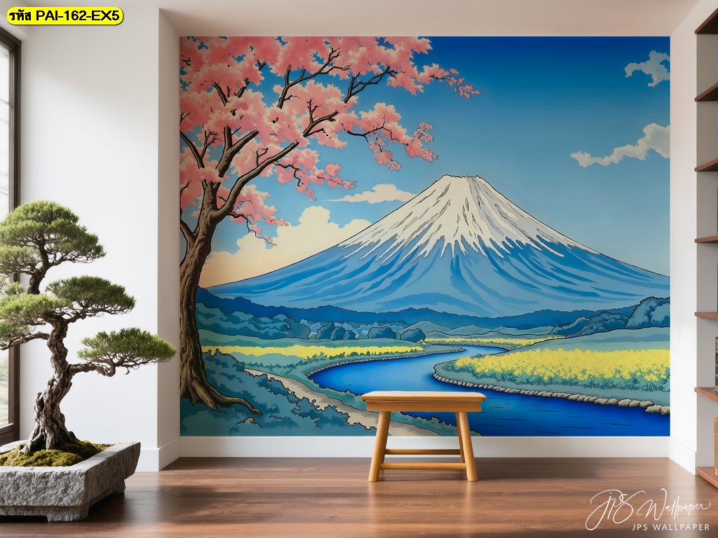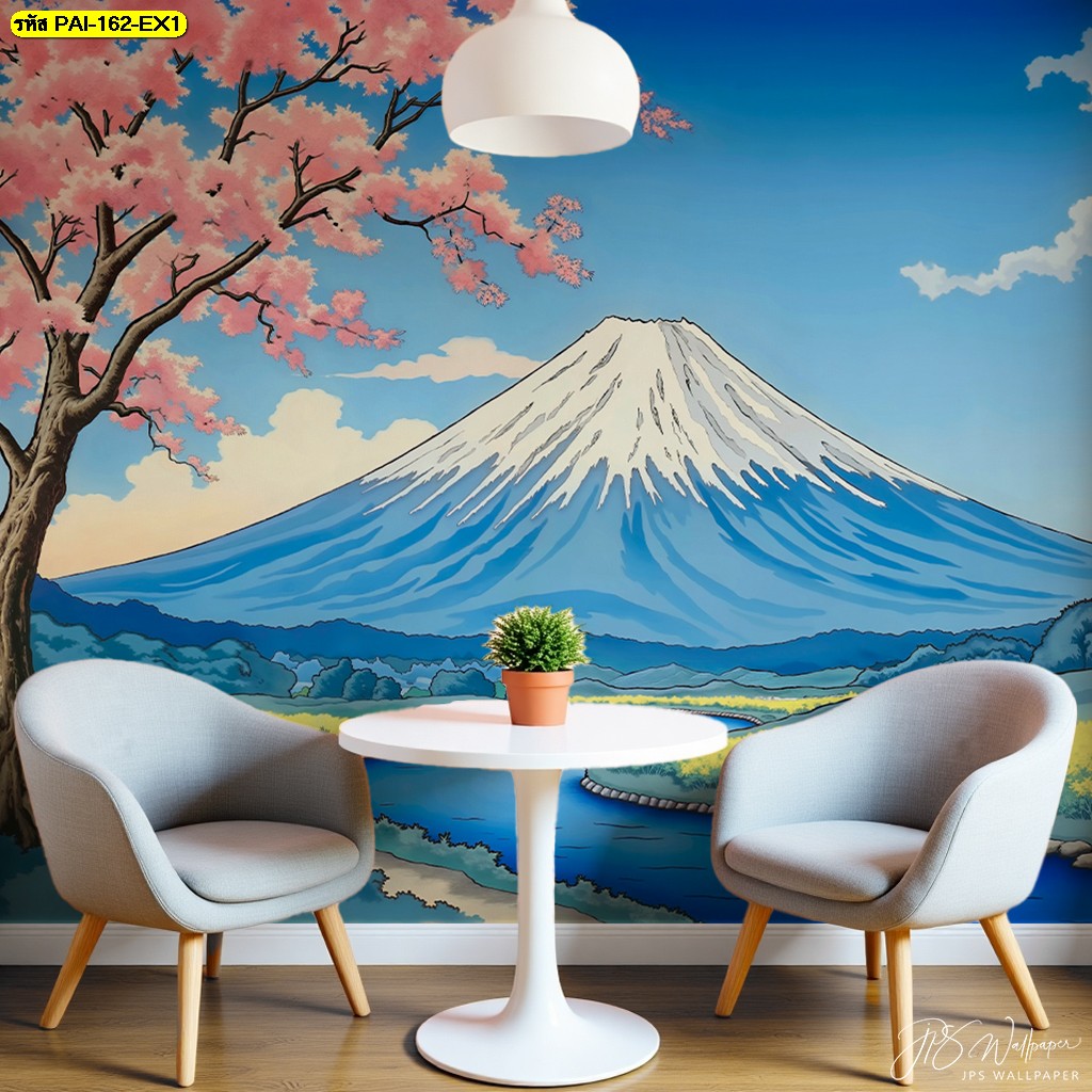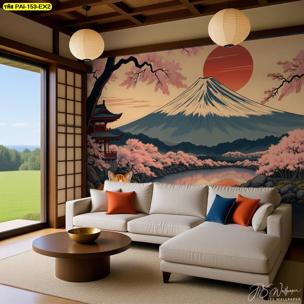 วอลเปเปอร์ลายภูเขาฟูจิและซากุระชมพูสะท้อนแสงยามเย็น เติมความสงบและกลิ่นอายญี่ปุ่นให้บ้านดู