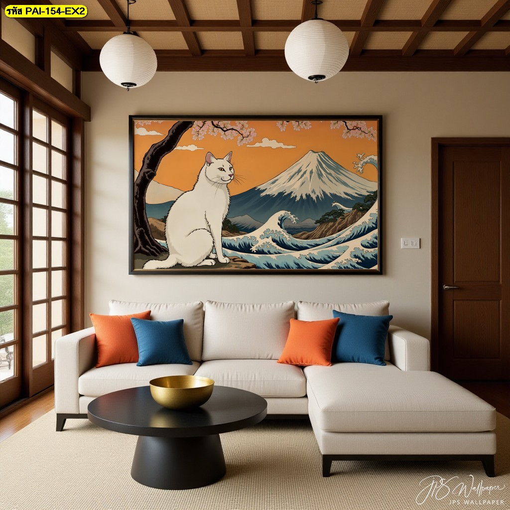 วอลเปเปอร์ลายแมวขาวกับคลื่นทะเลและภูเขาฟูจิ ถ่ายทอดพลังธรรมชาติและความสงบในแบบญี่ปุ่นร่วมส
