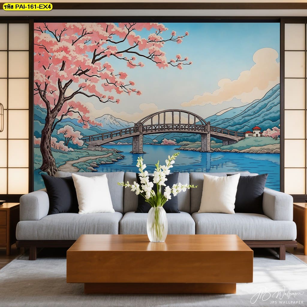 วอลเปเปอร์ลายสะพานญี่ปุ่นข้ามแม่น้ำใต้ต้นซากุระ ถ่ายทอดความอบอุ่นและความสมดุล เหมาะกับห้อง