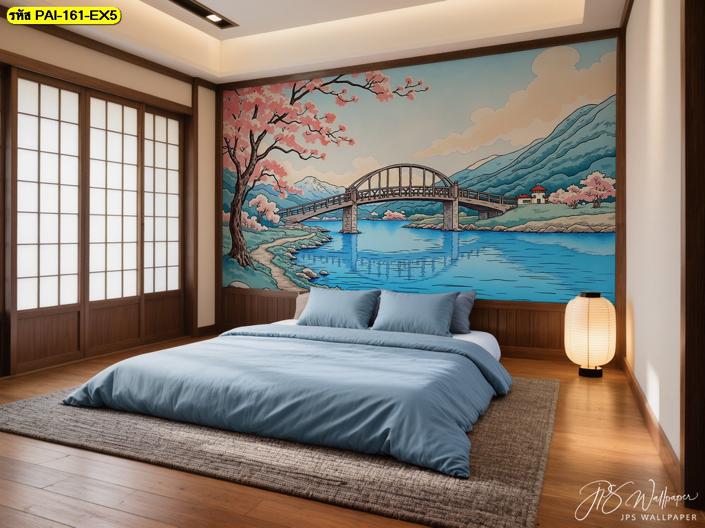 วอลเปเปอร์ลายสวนญี่ปุ่นและสะพานไม้กลางธรรมชาติ ถ่ายทอดความสงบเรียบง่าย เหมาะกับห้องนอนแนวร