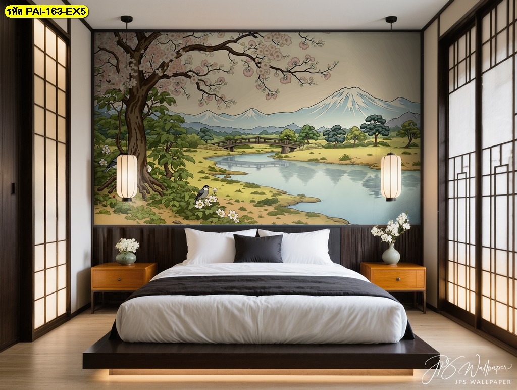 วอลเปเปอร์ลายสะพานญี่ปุ่นข้ามแม่น้ำใต้ต้นซากุระ ถ่ายทอดความอบอุ่นและความสมดุล เหมาะกับห้องนอนที่ชอบธรรมชาติ