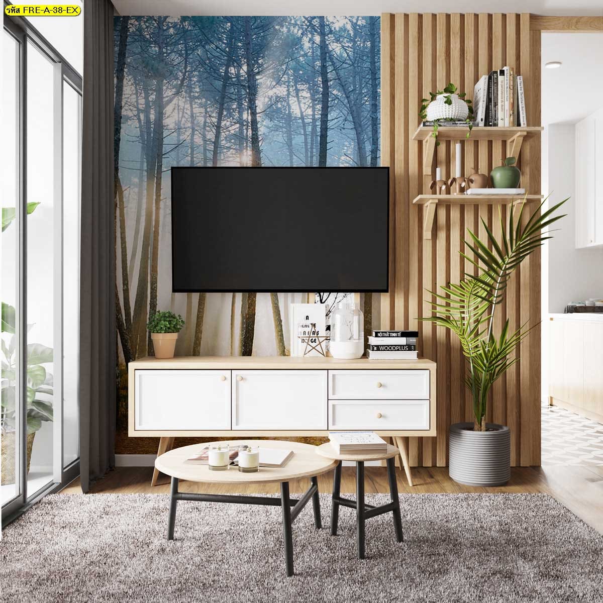 วอลเปเปอร์ป่าไม้ขนาดใหญ่ เพิ่มความรู้สึกใกล้ชิดธรรมชาติให้ห้องนั่งเล่นดูสบายและผ่อนคลาย