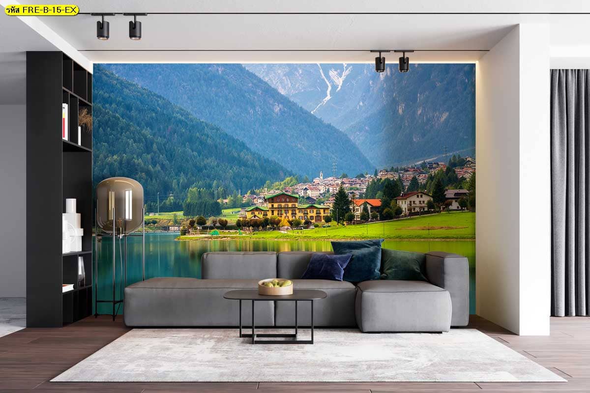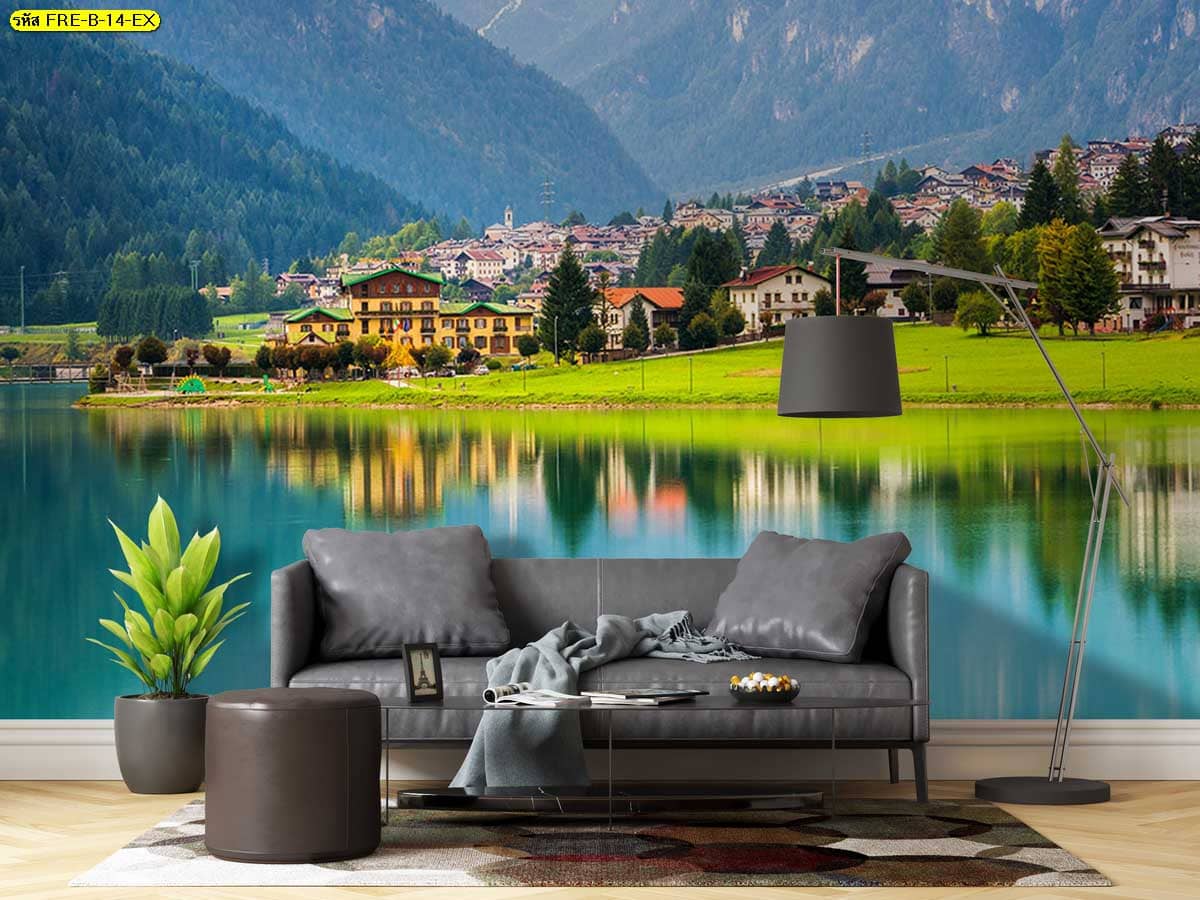 วอลเปเปอร์วิวทะเลสาบเมืองภูเขา เพิ่มมิติผนังห้องให้ดูกว้างและมีบรรยากาศผ่อนคลาย