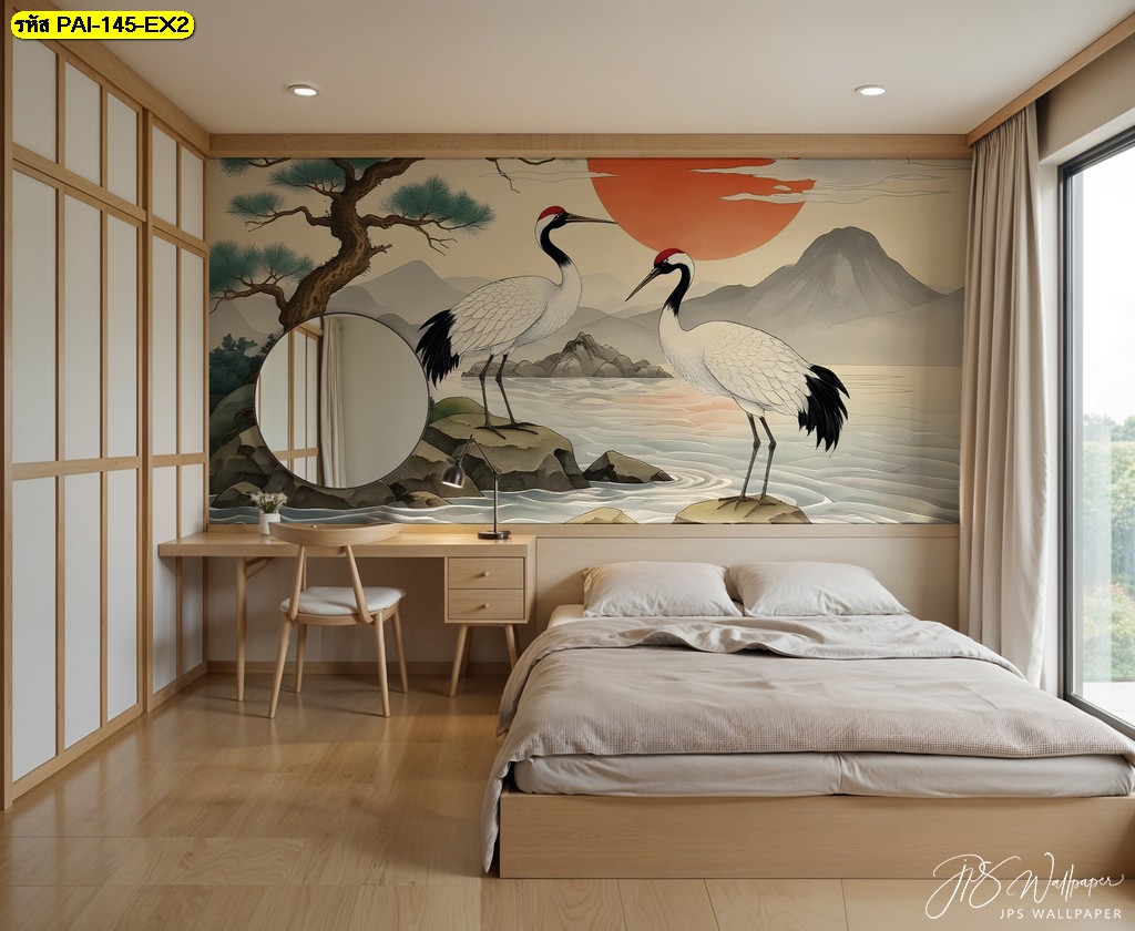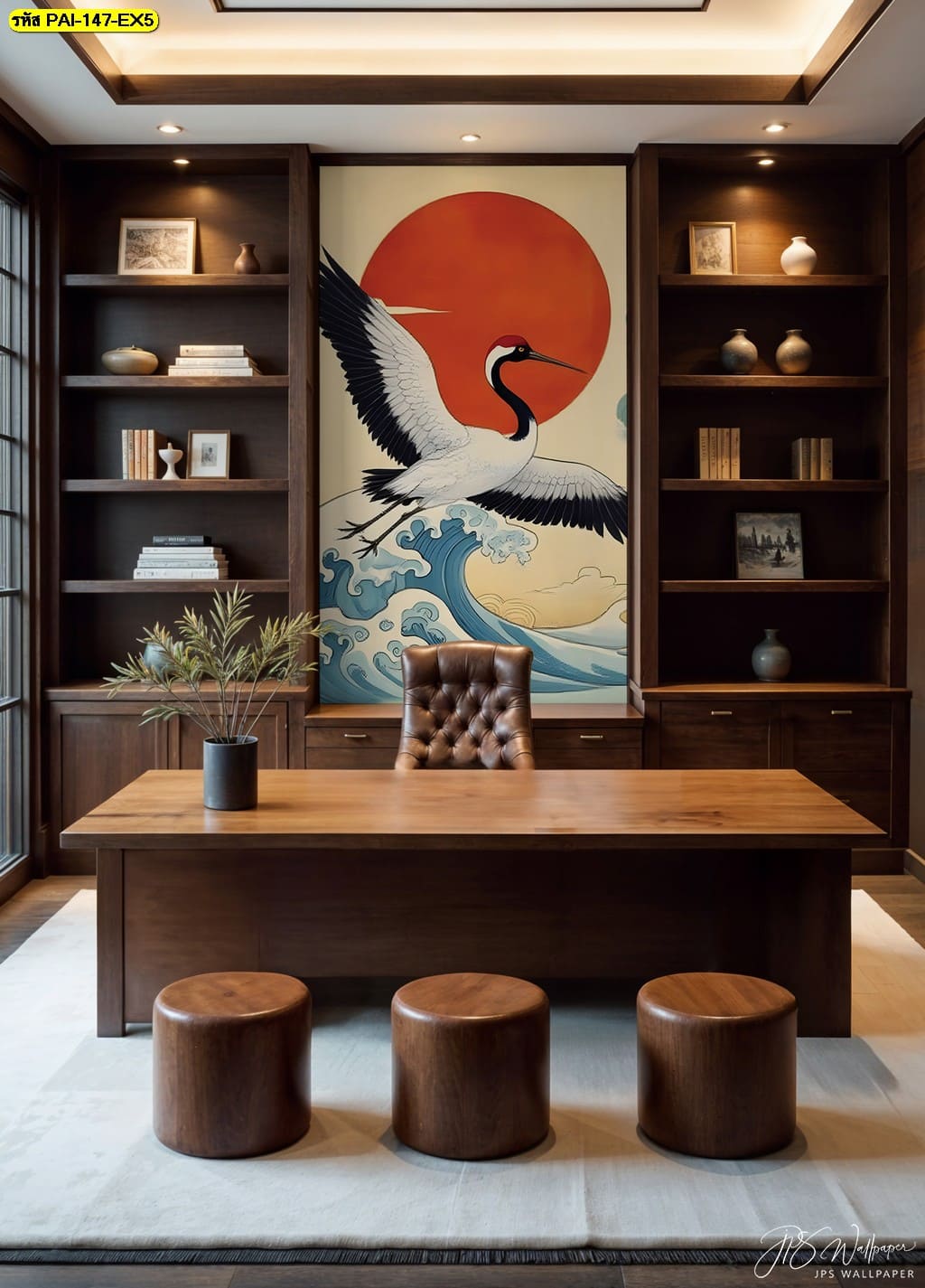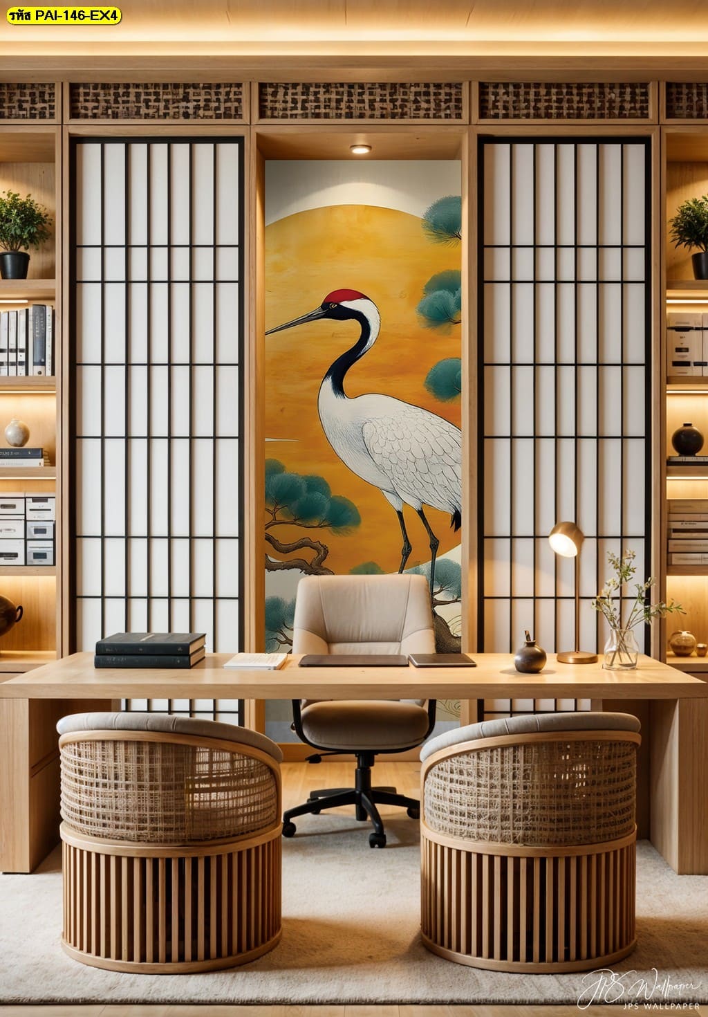 สร้างมุมทำงานสวยด้วยวอลเปเปอร์ลายนกกระเรียนญี่ปุ่น ,