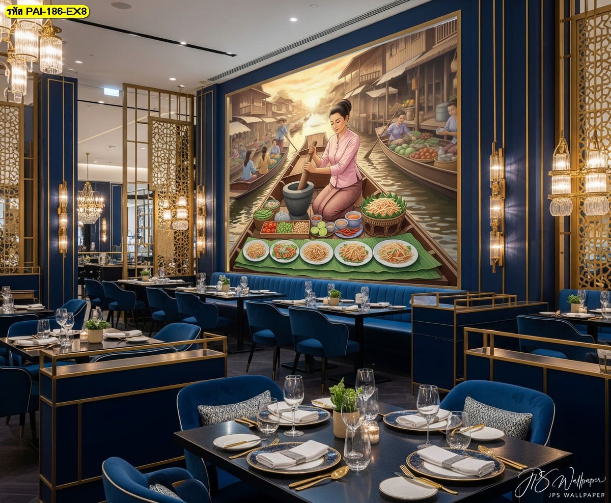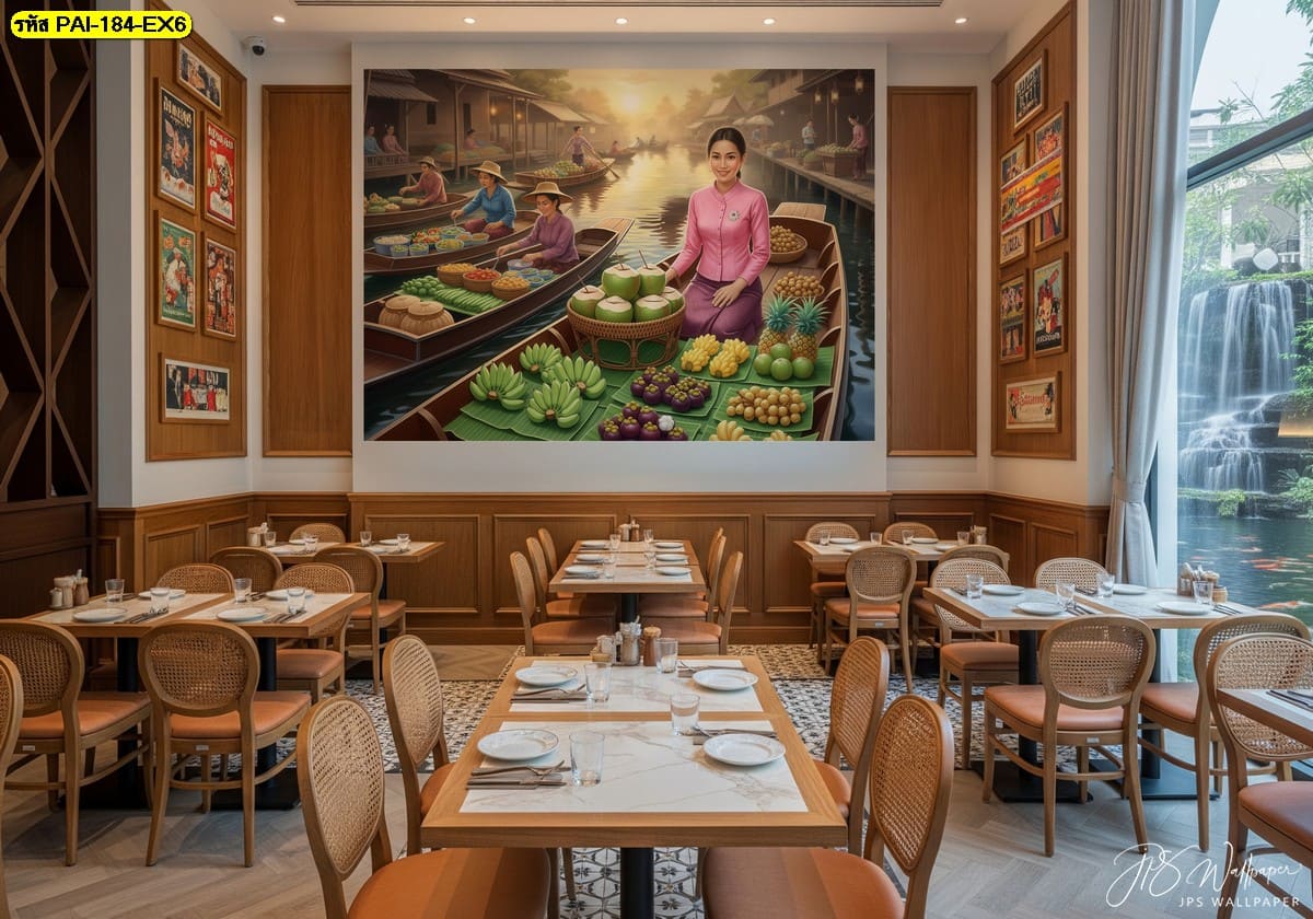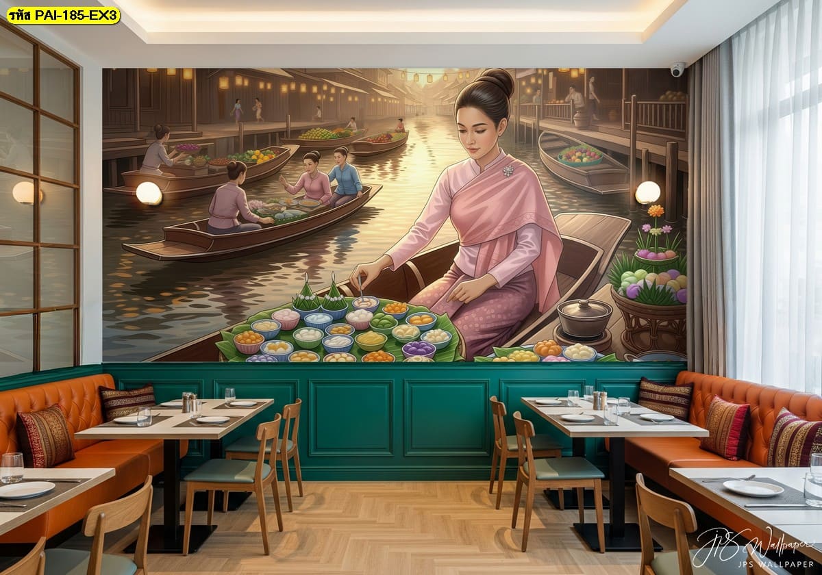 วอลเปเปอร์ฉากตลาดน้ำสไตล์ไทย ถ่ายทอดบรรยากาศตำส้มตำบนเรือ เพิ่มอารมณ์อบอุ่นและมีชีวิตชีวาให้ร้านอาหาร