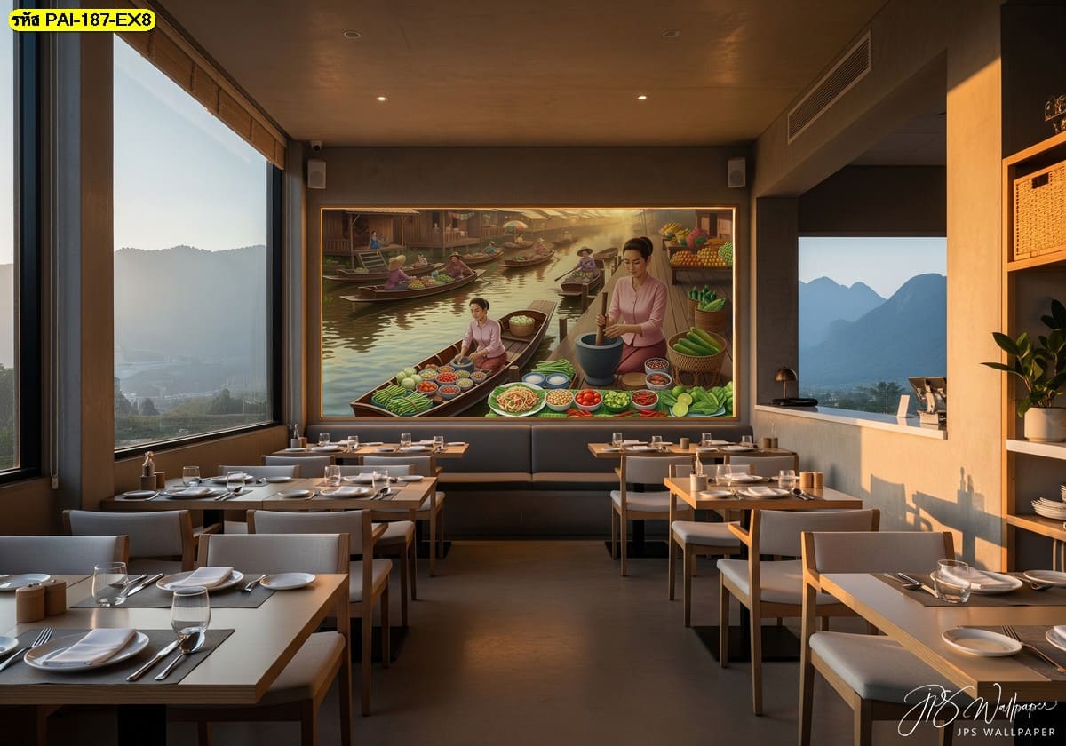วอลเปเปอร์ตลาดน้ำสื่อวิถีไทยอย่างอ่อนโยน ช่วยเติมชีวิตชีวาให้ร้านวิวภูเขาดูอบอุ่นและมีเสน่ห์เฉพาะตัว