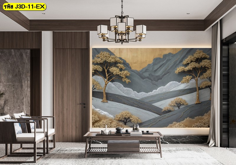 วอลเปเปอร์ภูเขาและใบไม้ทองแบบลอยตัว เพิ่มมิติศิลปะให้ห้องดูหรูสงบ เหมาะกับห้องนั่งเล่นทันสมัย