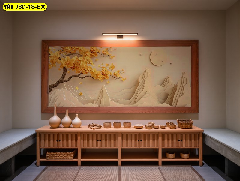 วอลเปเปอร์ภูเขาและใบไม้ทองแบบลอยตัว เพิ่มมิติศิลปะให้ห้องดูหรูสงบ เหมาะกับห้องนั่งเล่นทันส