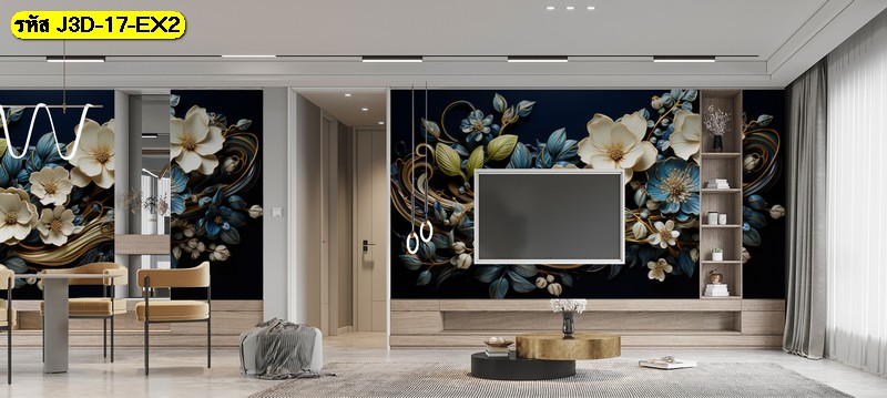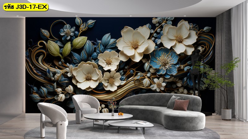 วอลเปเปอร์ดอกไม้สามมิติ โทนครามทอง เพิ่มความหรูละมุน เหมาะกับห้องนั่งเล่นที่ต้องการความโดดเด่นศิลป์