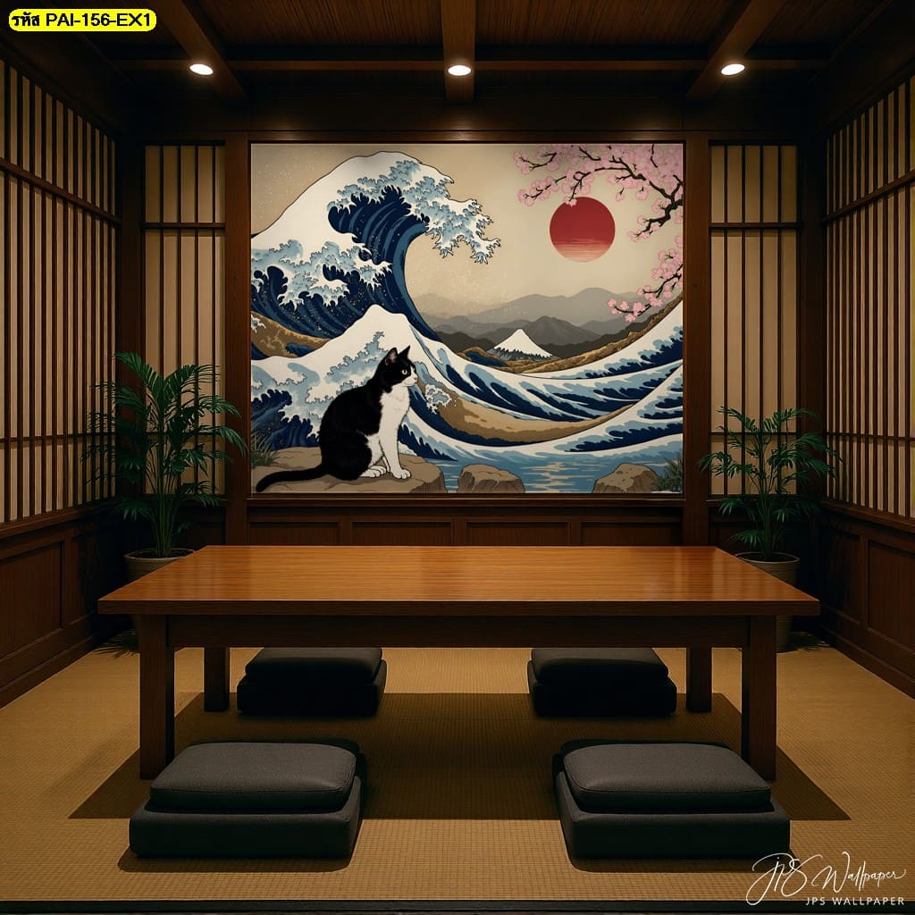 วอลเปเปอร์แมวญี่ปุ่นคู่คลื่นใหญ่ สื่อถึงพลังและความสมดุลของธรรมชาติ ภายใต้ความสงบแห่งภูเขา