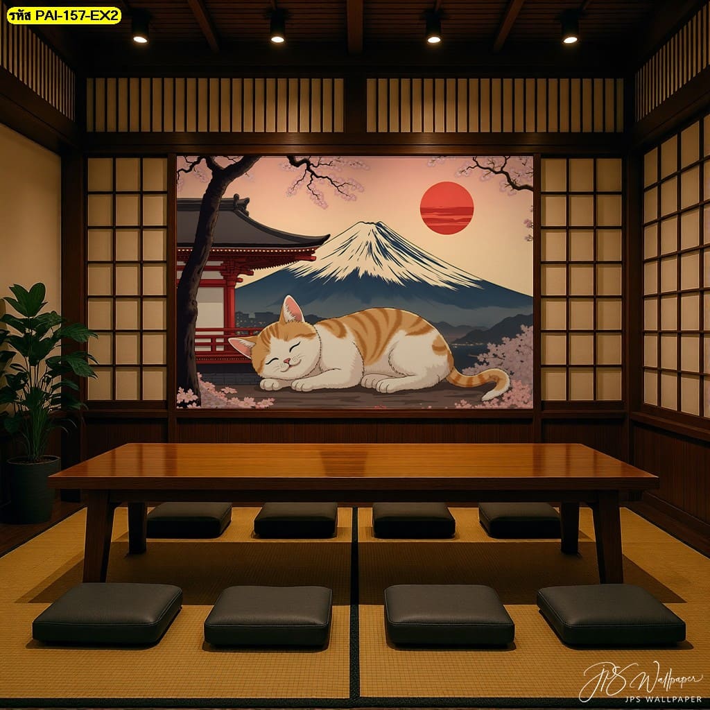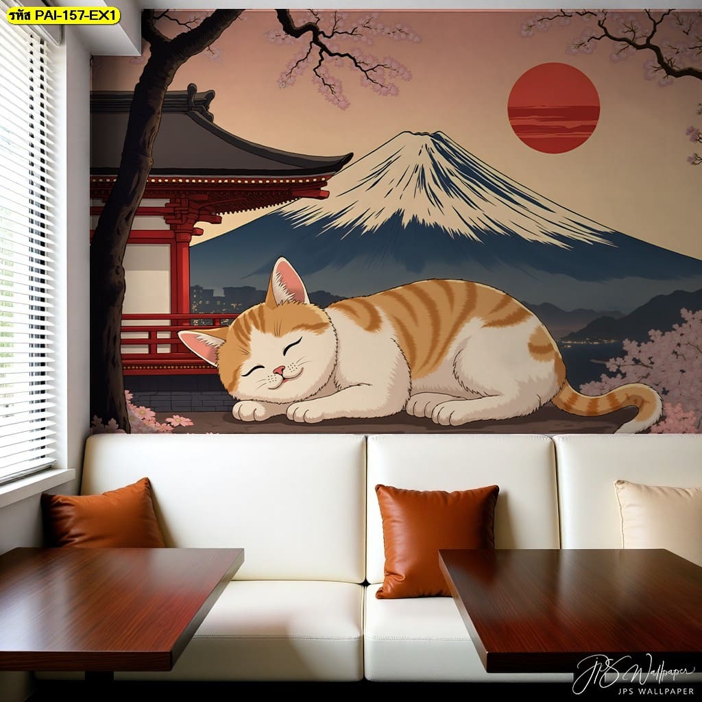 วอลเปเปอร์แมวส้มหลับใต้ซากุระและภูเขาไฟฟูจิ ถ่ายทอดความอบอุ่นและความสงบในทุกมุมห้อง