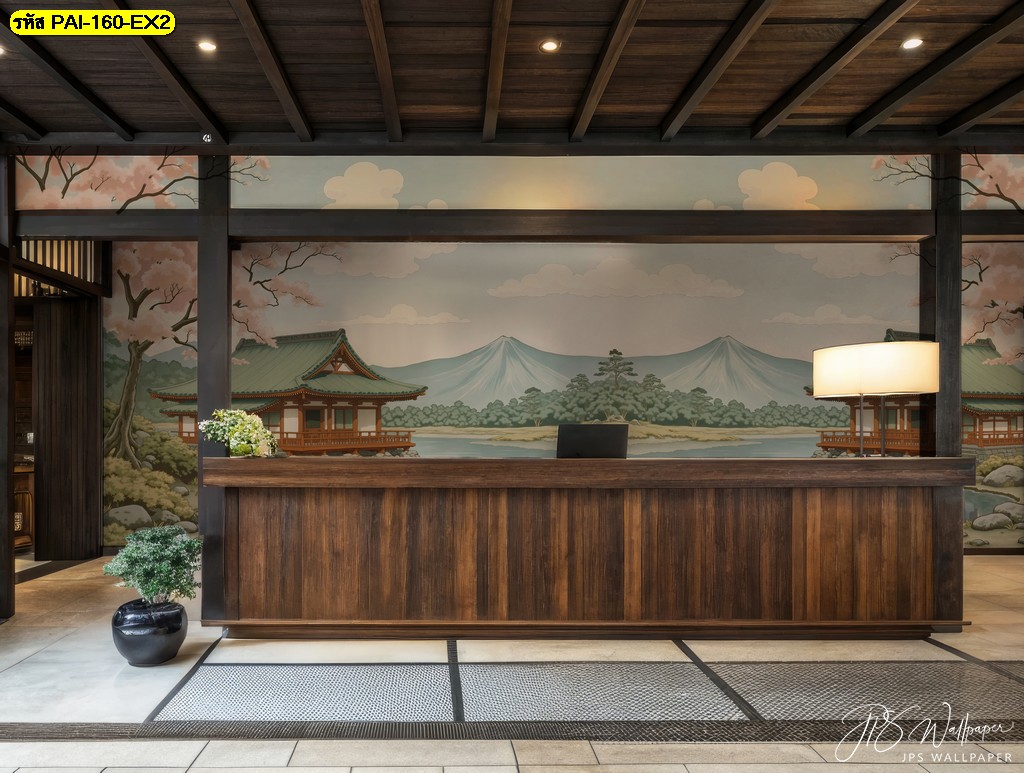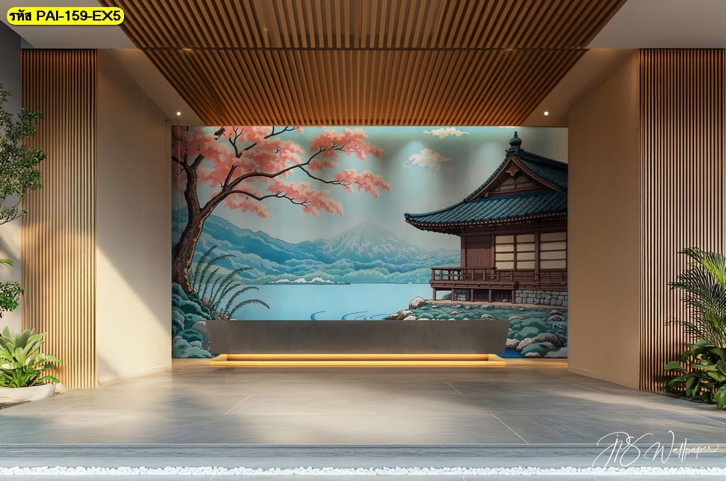 วอลเปเปอร์ญี่ปุ่นลายวัดและภูเขาไฟฟูจิ สื่อถึงความสงบ ความมั่นคง และความศรัทธาในธรรมชาติ