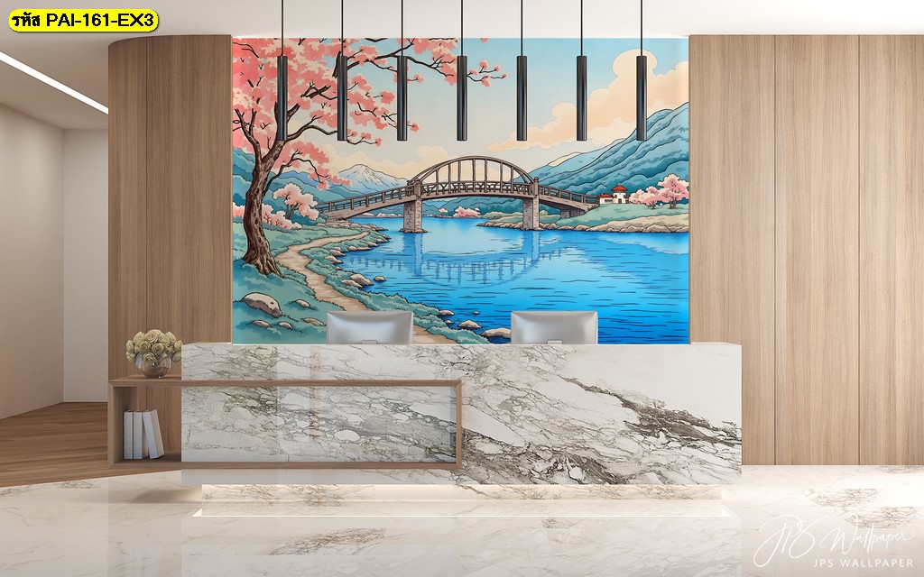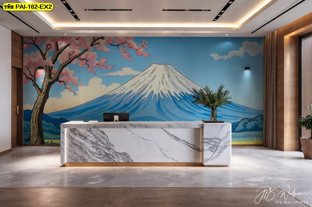 วอลเปเปอร์ภูเขาไฟฟูจิและต้นซากุระริมแม่น้ำ สื่อถึงความอ่อนโยนและความกลมกลืนระหว่างคนกับธรรมชาติ