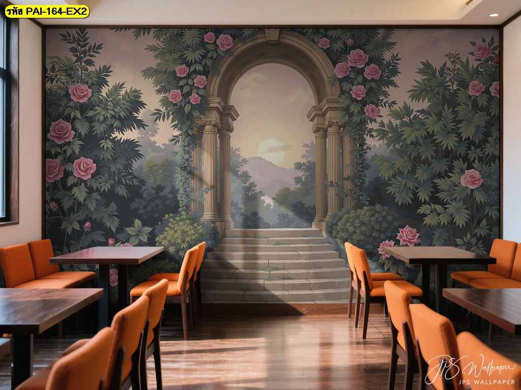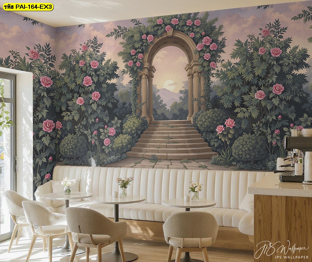 วอลเปเปอร์ซุ้มสวนกุหลาบแนวโรมัน เติมบรรยากาศอบอุ่นและหรูสงบให้ร้านกาแฟหรือบาร์สไตล์ยุโรป