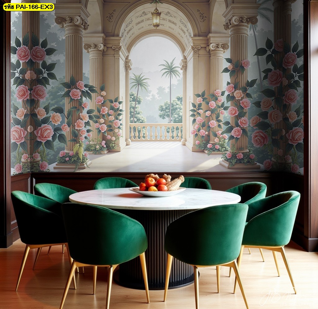 วอลเปเปอร์ซุ้มโรมันสุดหรู ผสานความอ่อนโยนของดอกกุหลาบ เติมมิติให้มุมรับประทานอาหาร