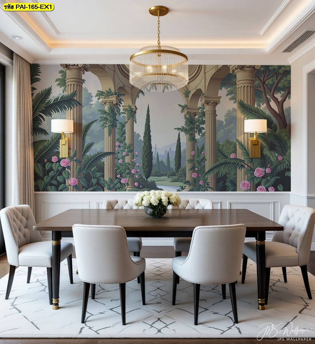 วอลเปเปอร์ซุ้มเสาโรมันกลางสวน สนามเขียวสบายตา เติมความหรูเรียบให้ห้องรับประทานอาหาร