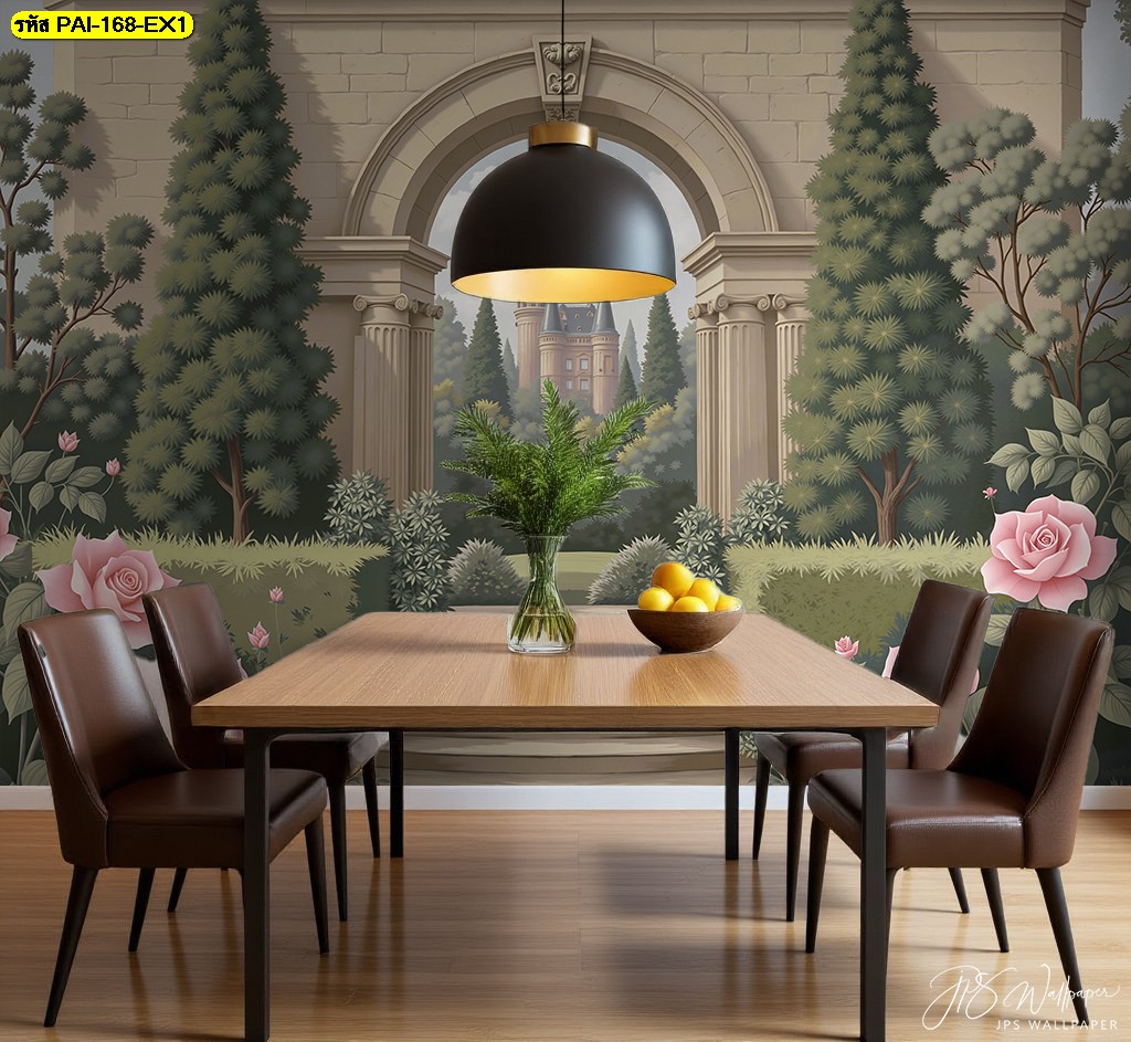 วอลเปเปอร์ทางเดินสู่ปราสาทยุโรป ล้อมด้วยกุหลาบบานสะพรั่ง เติมความโรแมนติกให้ห้องอาหาร