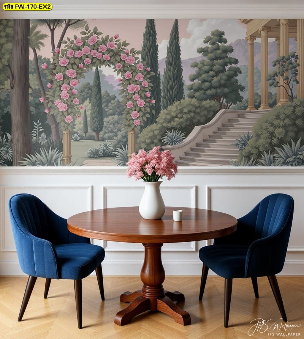 วอลเปเปอร์สวนยุโรปสุดหรู ล้อมด้วยซุ้มดอกกุหลาบและเสาโรมัน เติมความสงบและความมีระดับให้ห้อง