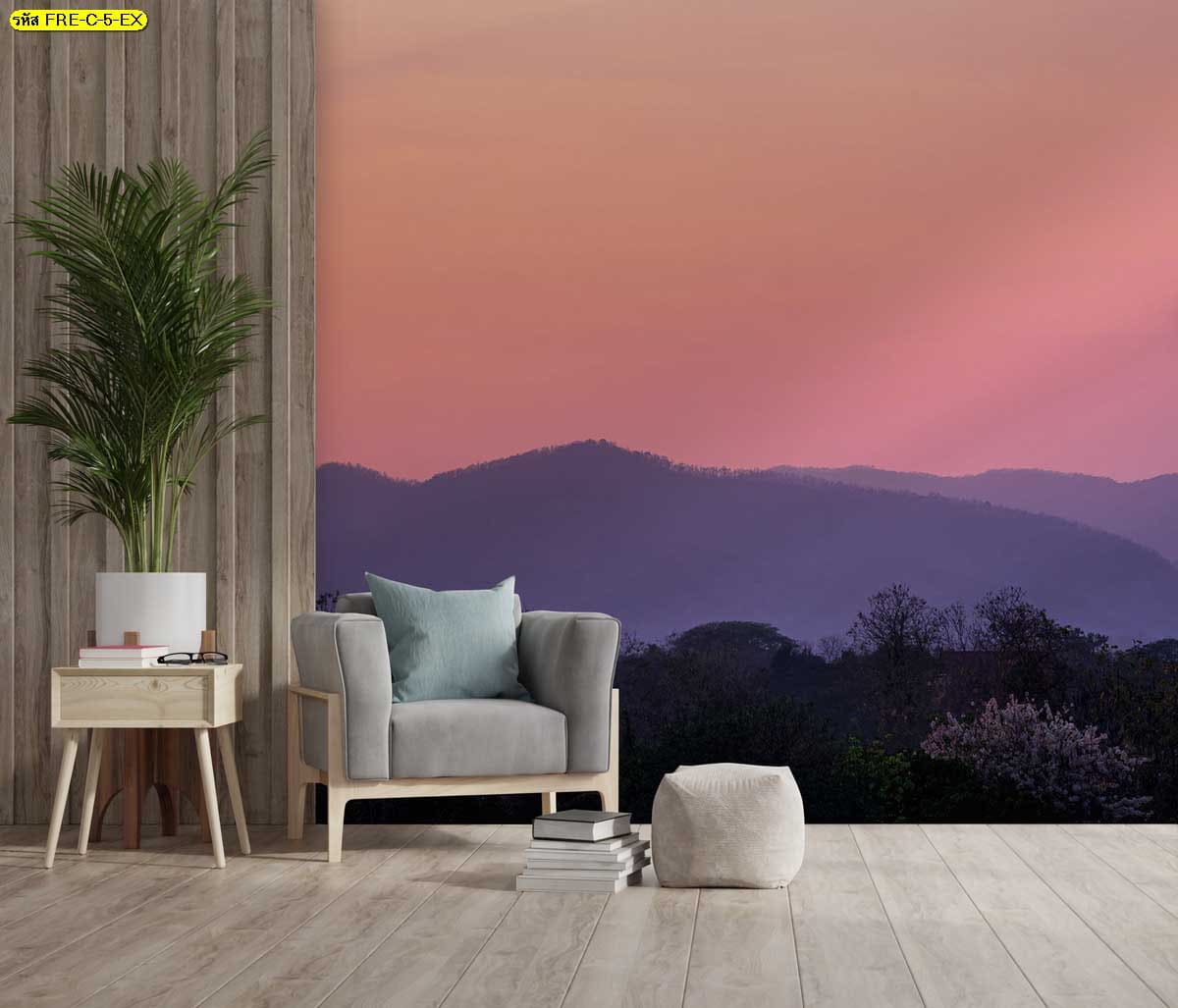 วอลเปเปอร์วิวภูเขายามเย็น โทนชมพูม่วง เพิ่มความนุ่มนวลให้ผนังห้อง ดูอบอุ่นและผ่อนคลาย