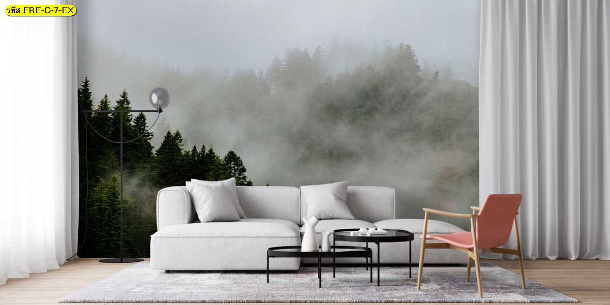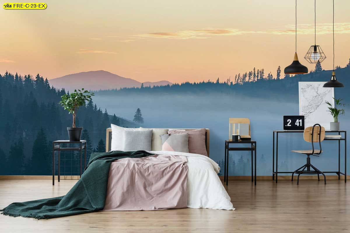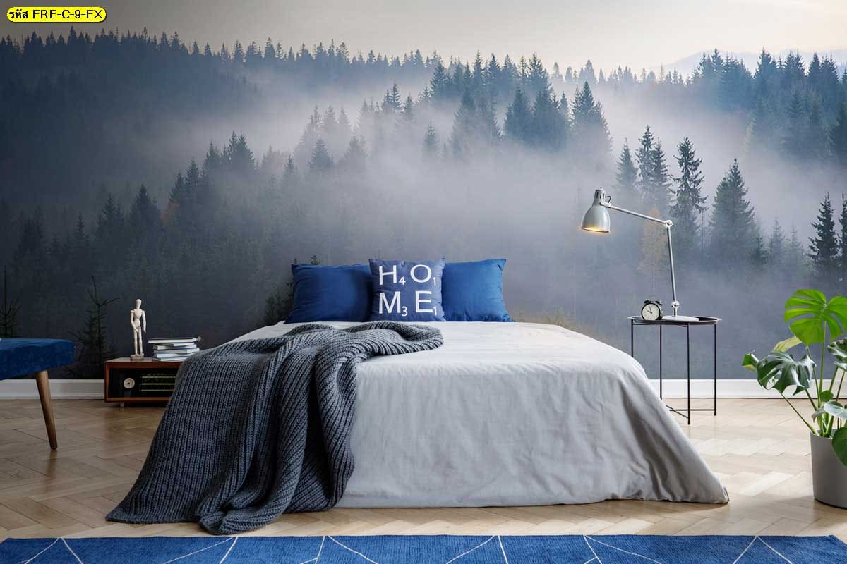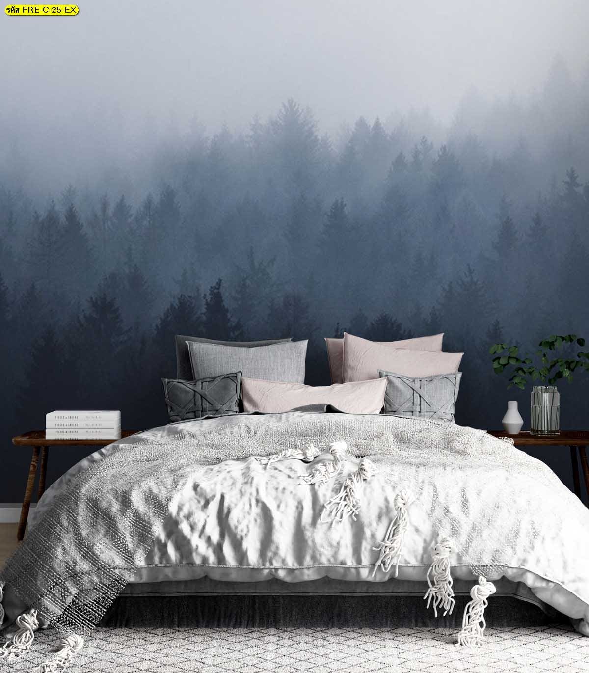 วอลเปเปอร์ป่าสนหมอกหนา เพิ่มความลึกให้ผนังห้องนอน ดูสงบและนุ่มนวล