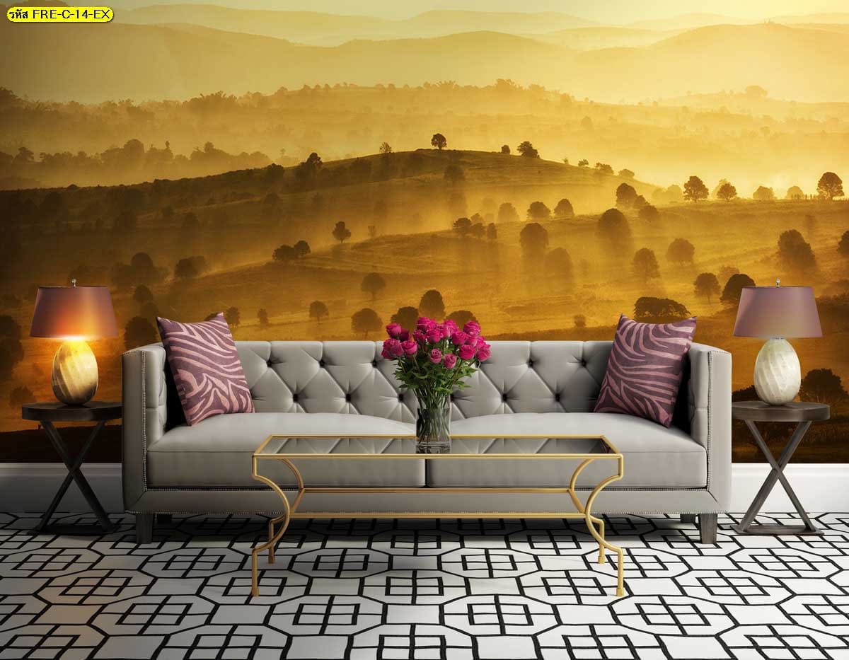 วอลเปเปอร์ติดผนังภาพสั่งพิมพ์วิวทุ่งหญ้ารับแสงทอง ศิลปะรูปแต่งห้องที่สื่อถึงความอบอุ่นในบ้