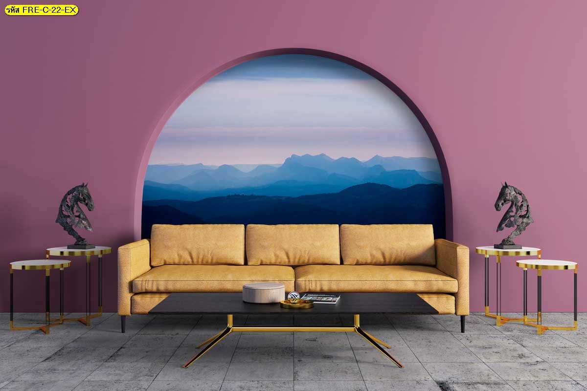 รูปติดผนังวอลเปเปอร์สั่งพิมพ์ลายภูเขาสีน้ำเงิน สื่อความสงบผ่านภาพสั่งพิมพ์แต่งห้องที่ดูผ่อ