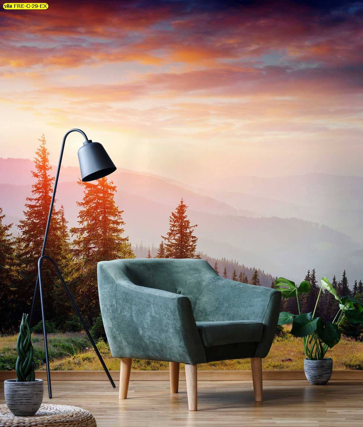 ภาพแต่งห้องป่าสนใต้แสงอรุณ วอลเปเปอร์สั่งพิมพ์ภาพสั่งพิมพ์ที่มอบความอบอุ่นรูปติดผนังแต่งห้
