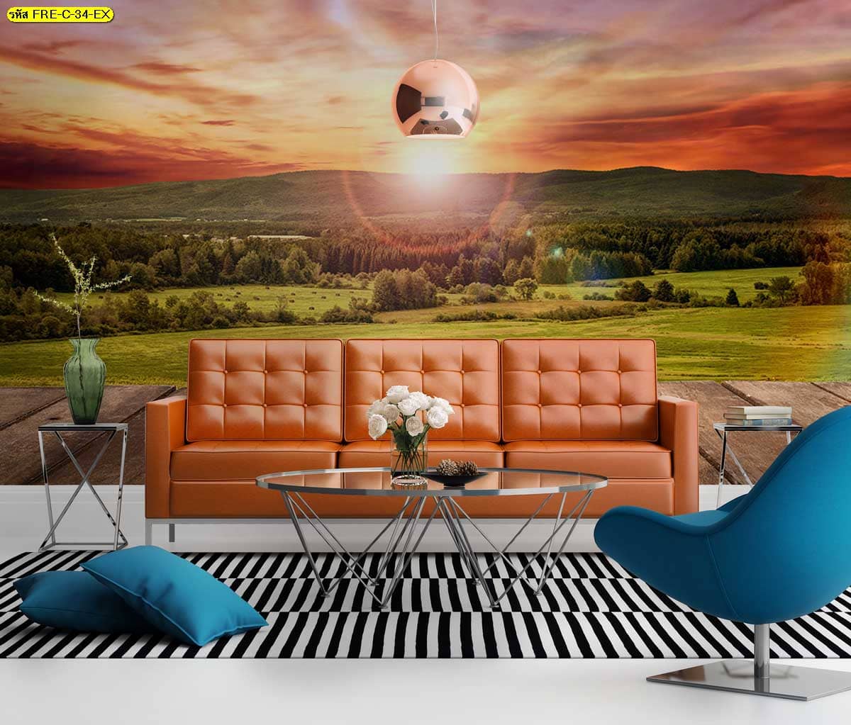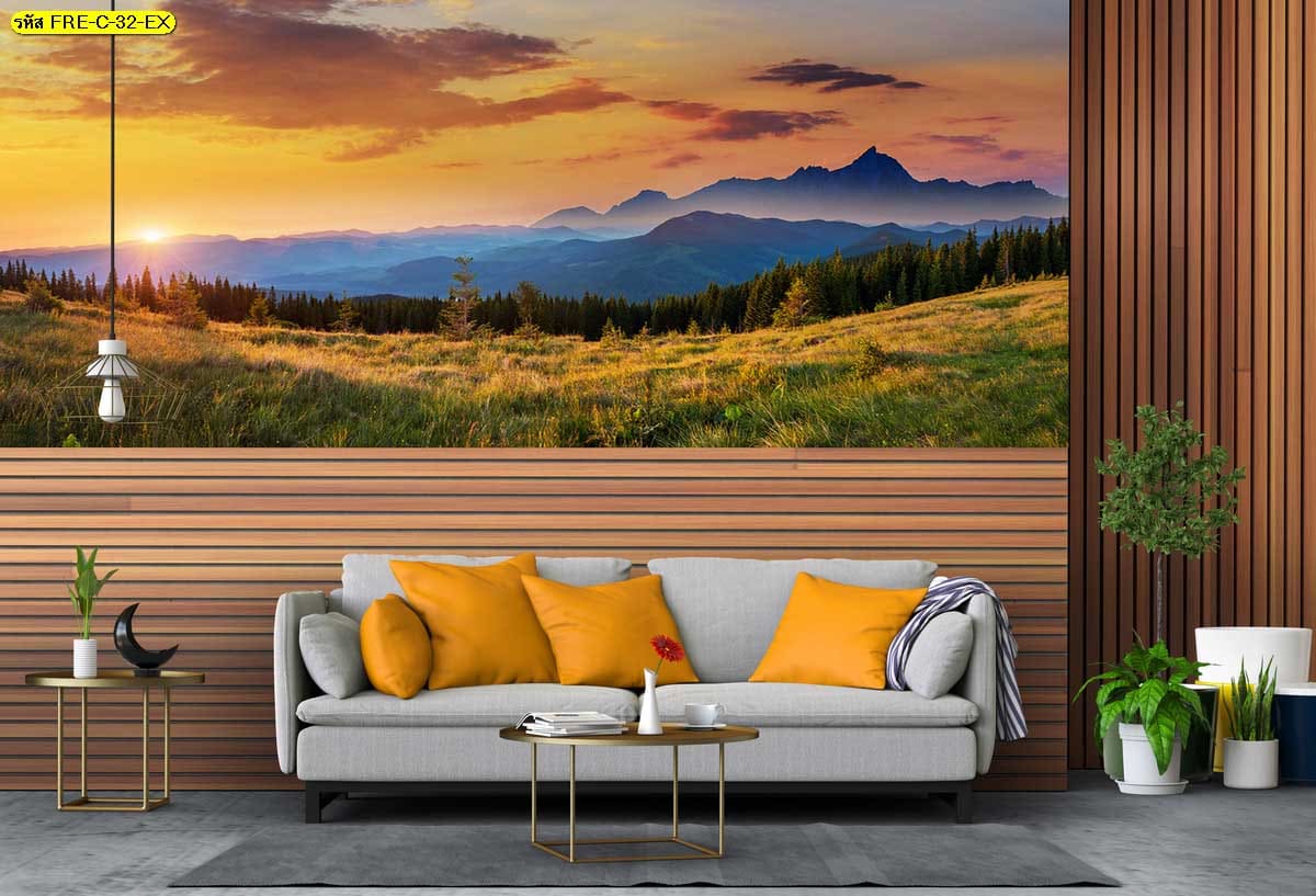 วอลเปเปอร์ติดผนังภาพสั่งพิมพ์วิวทุ่งหญ้ารับแสงทอง ศิลปะรูปแต่งห้องที่สื่อถึงความอบอุ่นในบ้าน