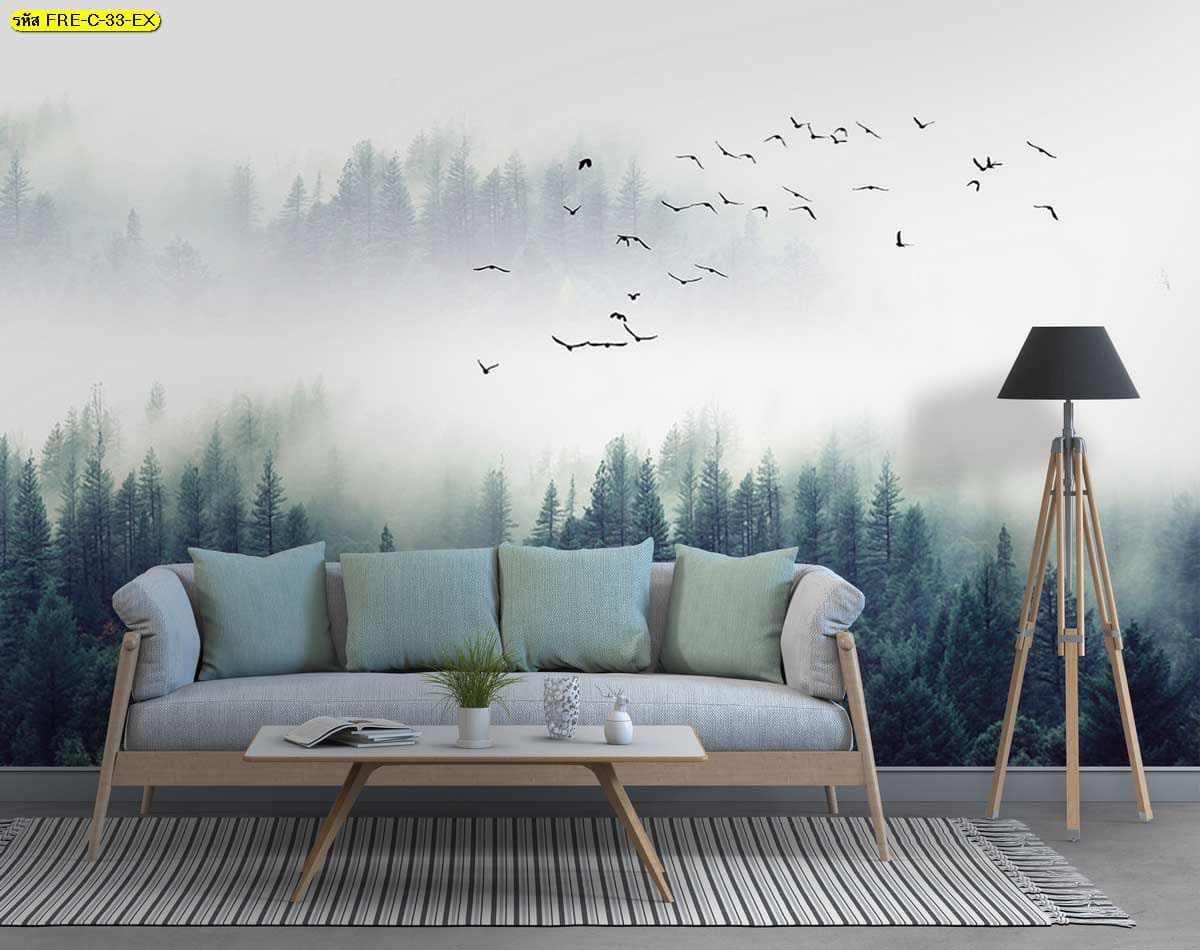 ภาพแต่งห้องวอลเปเปอร์สั่งพิมพ์ลายฝูงนกในป่าหมอก สื่อความหมายแห่งอิสระผ่านรูปติดผนังติดผนัง