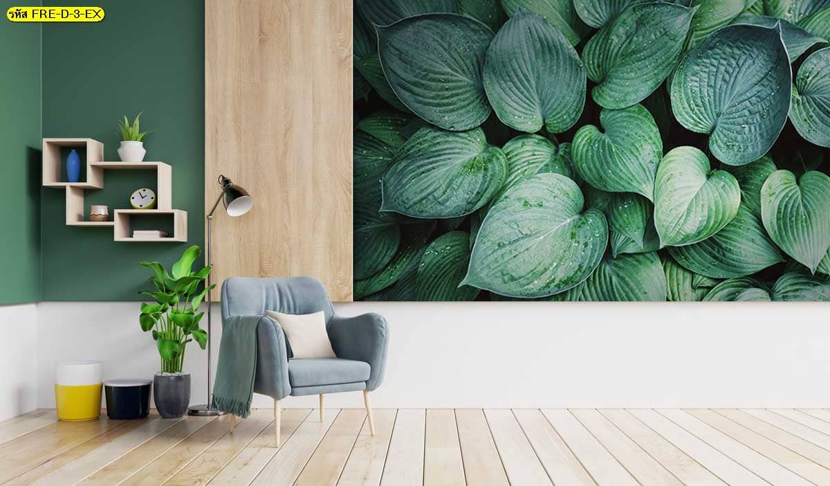 วอลเปเปอร์สั่งพิมพ์ลายใบไม้มีหยดน้ำ สื่อความชุ่มฉ่ำในรูปแต่งห้อง